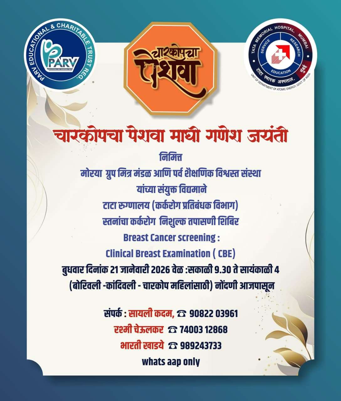 प्रति वर्षी प्रमाणे उपरोक्त मंडळाच्या वतीने मिती माघ शुध्द चतुर्थी फाल्गुन शके १९४७ गुरुवार दिनांक २२ जानेवारी २०२६ ते बुधवार दिनांक २८ जानेवारी २०२६ या कालावधीत “माघी गणेशोत्सव” साजरा करण्यात येत आहे. मंडळाच्या वतीने सांस्कृतीक व धार्मिक कार्यक्रमाचे आयोजन करण्यात आले आहे, आपण या कार्यक्रमांस उपस्थित रहावे हेच आग्रहाचे निमंत्रण ! चारकोपचा राजा या मंडळाची