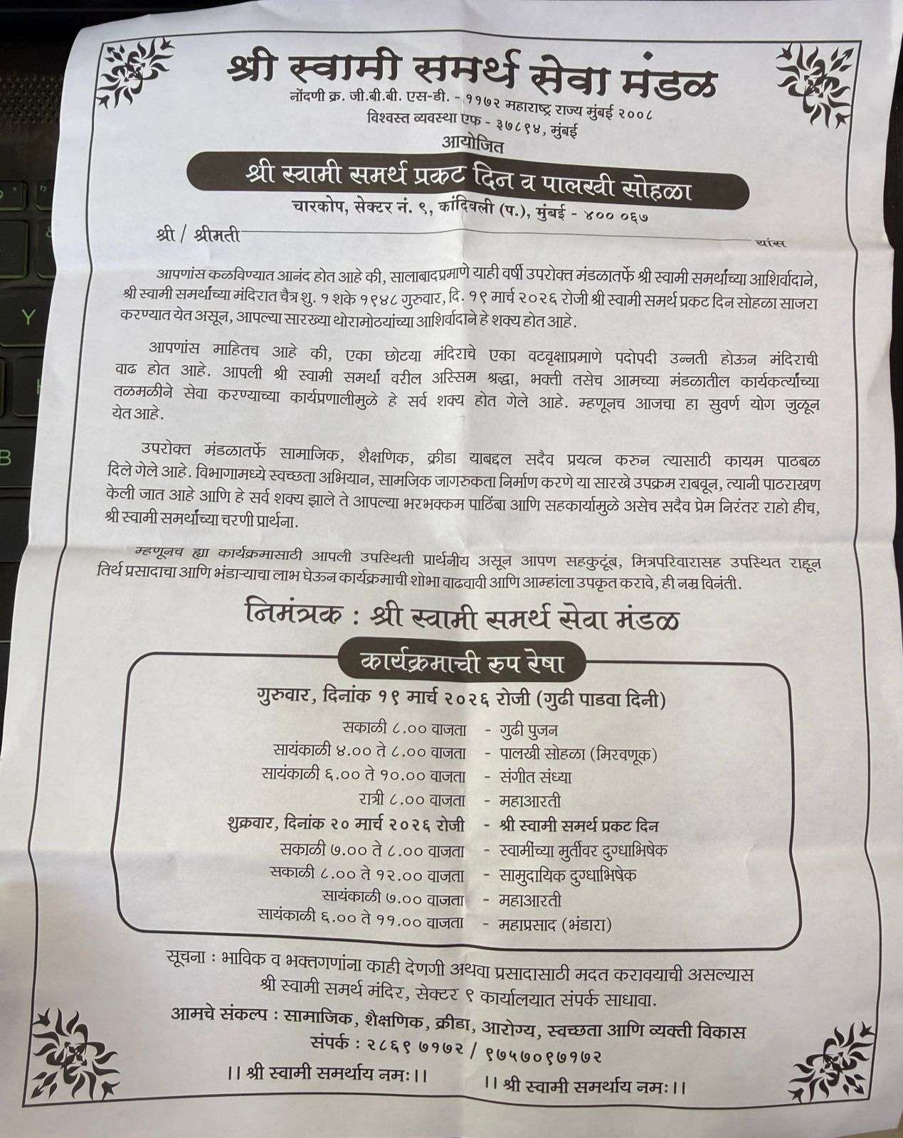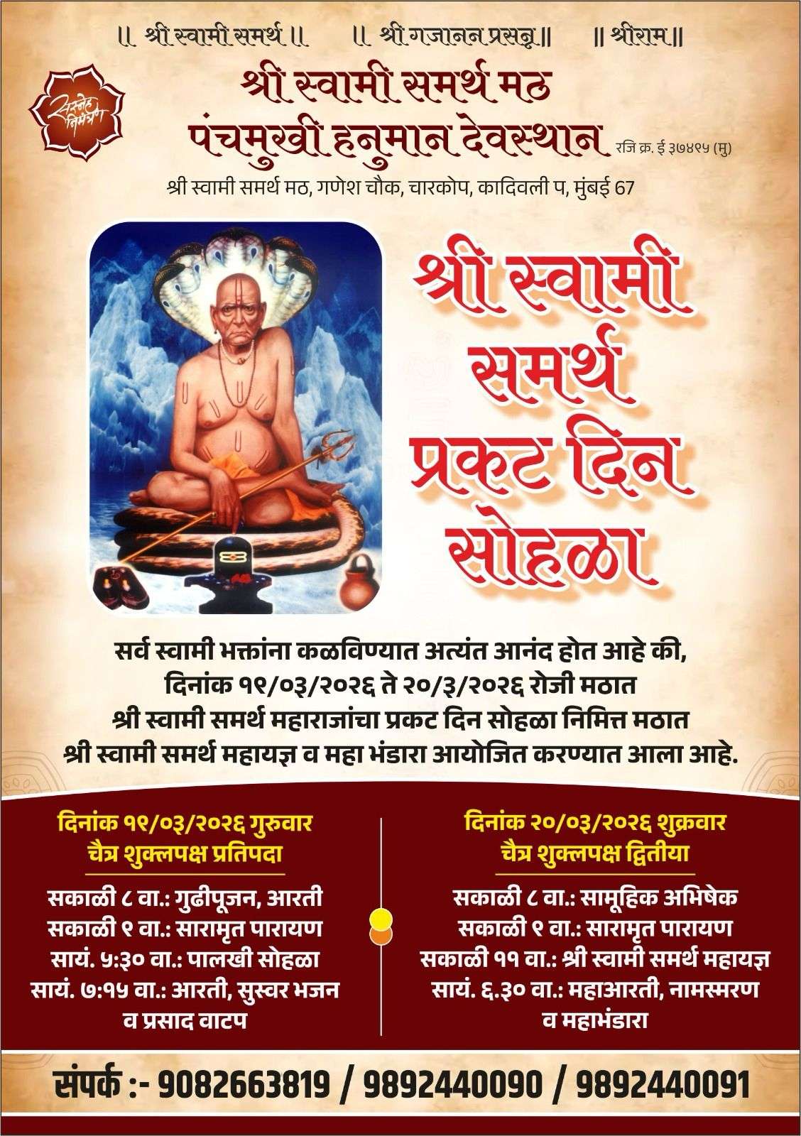 प्रति वर्षी प्रमाणे उपरोक्त मंडळाच्या वतीने मिती माघ शुध्द चतुर्थी फाल्गुन शके १९४७ जय गुरुवार दिनांक २२ जानेवारी २०२६ ते बुधवार दिनांक २८ जानेवारी २०२६ या कालावधीत “माघी गणेशोत्सव” साजरा करण्यात येत आहे, मंडळाच्या वतीने सांस्कृतीक व धार्मिक कार्यक्रमाचे आयोजन करण्यात आले आहे, आपण या कार्यक्रमांस उपस्थित रहावे हेच आग्रहाचे निमंत्रण ! चारकोपचा सम्राट मित्र मंडळ,